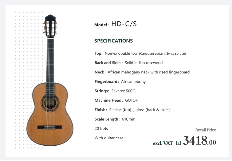 The result is dramatically increased vibrational efficiency, yielding greater projection, wider dynamic range, and enhanced responsiveness. At the same time, the Nomex core reduces the natural variability of wood, ensuring exceptional consistency from instrument to instrument.The sound retains the warmth and tonal sweetness of a traditional guitar while offering the power, clarity, and dynamic control demanded by the modern concert stage.